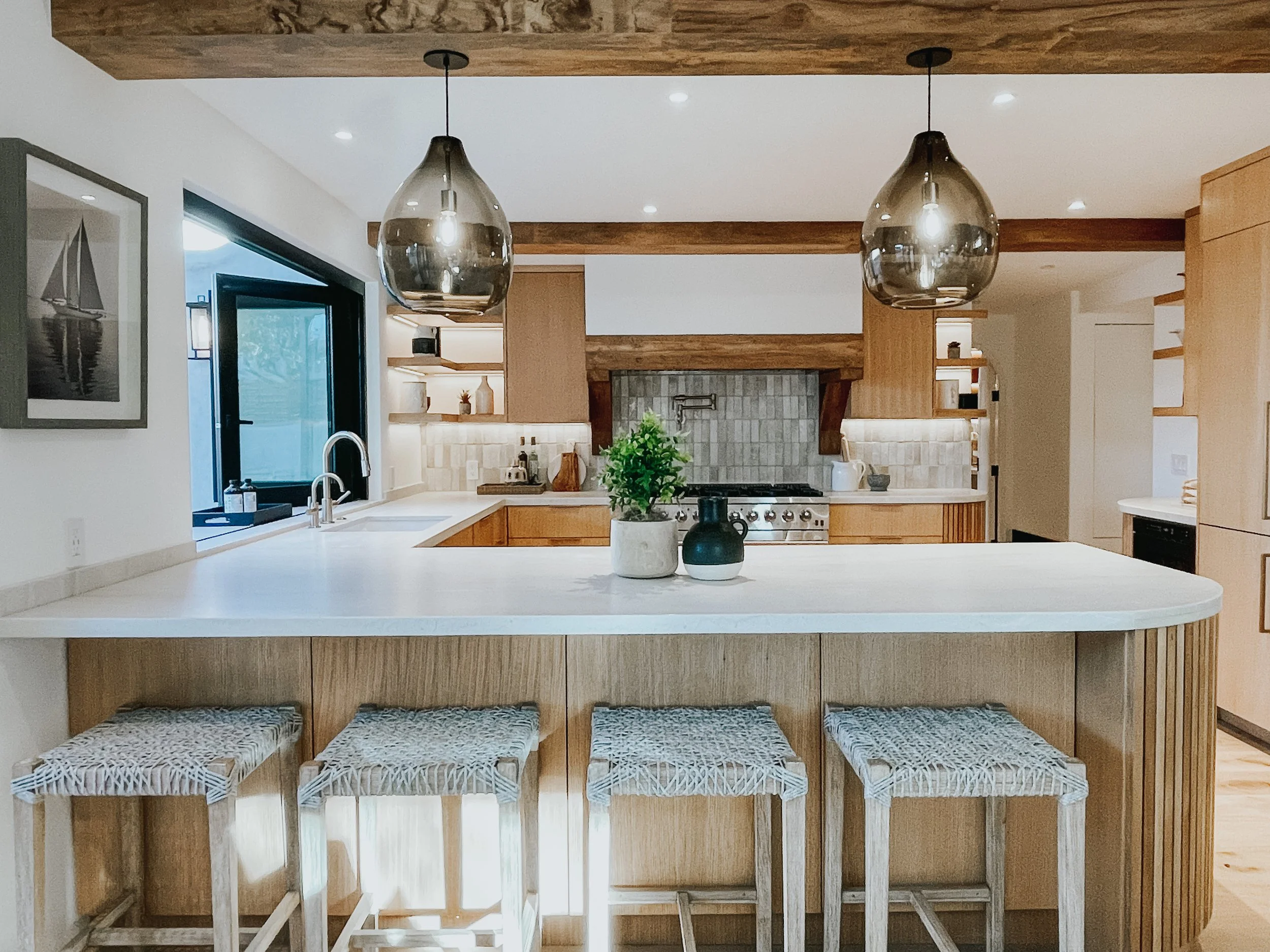 The kitchen is a true masterpiece, and not a single detail was left out. From the beautiful oak cabinets and the exposed beams, making the space feel organic, to the textured stone backslash, create a light and easy balance to the space. We especially loved the oversized window that opens to the side deck, creating a uniquely modern indoor-outdoor feel. Pieces for the kitchen were chosen to compliment the finishes and materials with a few pops of black to bring contrast to the space.