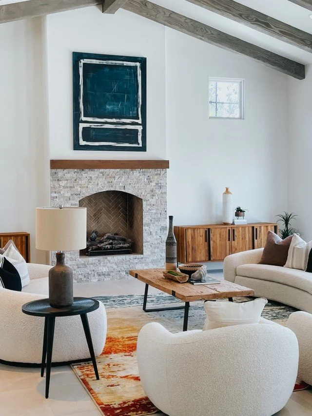 When choosing artwork and placement, you always want to keep in mind your starting point, the home itself. These wood beams, for example, draw your eye to the center of the fireplace, so adding artwork here is key because it is the focal point of the room.